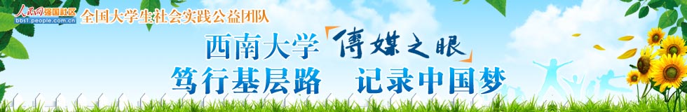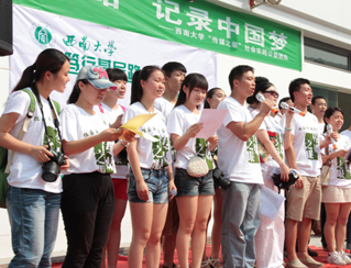 西南大學(xué)“傳媒之眼”社會實踐隊由新聞傳媒學(xué)院團委老師李海峰、范曦帶隊,8名研究生、19名本科生組成。團隊圍繞“篤行基層路,記錄中國夢”的主題,自7月3日開始,從建設(shè)生態(tài)北碚、“百姓中國夢”主題宣講、“幸福重慶”人文記錄、“山城百姓”社會調(diào)查四個方面開展活動。團隊已經(jīng)在歇馬鎮(zhèn)碚青路中心廣場舉行了文藝匯演,并給群眾帶來了各種各樣的避暑藥品;到歇馬污水處理廠,了解當(dāng)?shù)厣a(chǎn)生活污水的處理;到重慶歇馬機械曲軸有限公司,宣傳“節(jié)能生產(chǎn)”理念,在員工中開展環(huán)保培訓(xùn),強調(diào)可持續(xù)生產(chǎn)和發(fā)展。