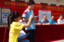 7月10日上午,湖北汽車工業(yè)學院“V益·青竹”暑期愛心支教團的大學生們在蔣家堰鎮(zhèn)中原小學舉行愛心捐贈活動。湖北汽車工業(yè)學院副院長閔祖?zhèn)魍、縣教育局副局長周躍忠同志以及相關(guān)領(lǐng)導都趕來支持。