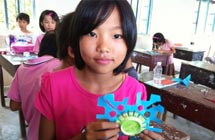 活動(dòng)現(xiàn)場(chǎng),孩子們盡情發(fā)揮自己的想象,用有限的廢紙、易拉罐等廢棄材料創(chuàng)造出了各種富有特色的手工藝作品。許多學(xué)生的創(chuàng)意作品超出了隊(duì)員們的想象,隊(duì)員們?nèi)滩蛔∨氖纸泻。雷州市烏石?zhèn)三教小學(xué)六年級(jí)學(xué)生用日常可見的易拉罐瓶設(shè)計(jì)出簡(jiǎn)易的小垃圾桶。將平凡的垃圾桶擬人化,還在設(shè)計(jì)出來(lái)的垃圾桶上寫著“保護(hù)環(huán)境、愛護(hù)家園”等標(biāo)語(yǔ)。二年級(jí)學(xué)生設(shè)計(jì)出的綠色太陽(yáng)花,說(shuō)那是一朵綠花,那是一個(gè)希望。