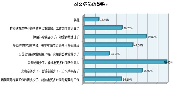 “八項規(guī)定”的執(zhí)行給公務員帶來的最大影響是什么?本次調查中,排名前三位的影響依次是“公務吃請少了,能抽出更多時間陪伴家人”(79.4%)、“津貼補貼獎金少了,勒緊褲帶過日子”(59.8%)和“文山會海少了,空話套話少了,工作效率高了”(55.9%)。