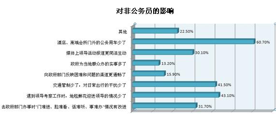 還有三到五成受訪公務員認為“辦公經(jīng)費控制更嚴格,需要更加節(jié)約地使用辦公用品”、“群眾滿意度在業(yè)績考核中比重增加,工作態(tài)度更認真了”和“陪同領導考察工作的情況少了,能抽出更多時間處理其他工作”是“八項規(guī)定”帶來的幾大影響。