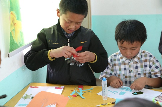 在海雀村的活動(dòng)中,兩個(gè)小朋友在志愿者的幫助下認(rèn)真的完成手工制作。
