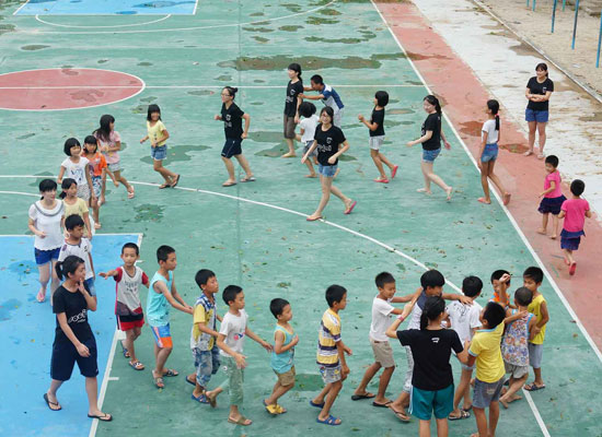 志愿者與孩子們在操場做游戲