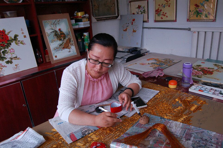 正在制作一帶一路主題掐絲畫(huà)的高芬平