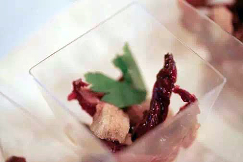 牛肉選用的是最嫩的腿肉部分,加入香料,文火慢燉,晾涼,切薄片后,上面覆蓋金槍魚醬汁。肉香與魚的鮮美巧妙的結(jié)合,清淡與濃稠交合,一軟一硬,正詮釋了美食藝術(shù)的和諧之處。在盛夏中,享受著浪漫的地中海的陣陣清爽的海風(fēng)。