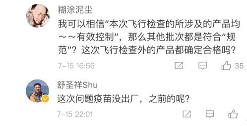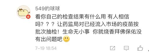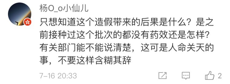 網(wǎng)友“楊O_o小仙兒”表示:“只想知道這個(gè)造假帶來(lái)的后果是什么?是之前接種過(guò)這個(gè)批次的都沒(méi)有藥效還是怎樣?有關(guān)部門(mén)能不能說(shuō)清楚,這可是人命關(guān)天的事,不要這樣含糊其辭!