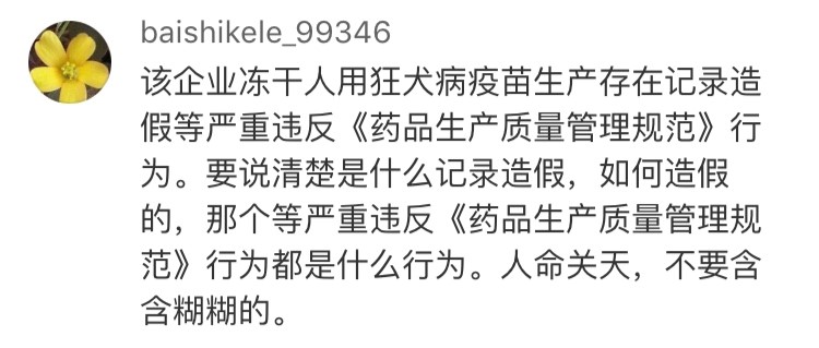 網(wǎng)友“baishikele_99346”認(rèn)為:“要說(shuō)清楚是什么記錄造假,如何造假的,那個(gè)等嚴(yán)重違反《藥品生產(chǎn)質(zhì)量管理規(guī)范》行為的都是什么行為。人命關(guān)天,不要含含糊糊。”