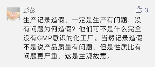 也有網(wǎng)友認(rèn)為:“生產(chǎn)記錄造假一定是生產(chǎn)有問(wèn)題,沒(méi)問(wèn)題為什么造假?他們可不是沒(méi)有GMP意識(shí)的化工廠。當(dāng)然記錄造假不是說(shuō)產(chǎn)品質(zhì)量有問(wèn)題,但是性質(zhì)比問(wèn)題更嚴(yán)重,這是主觀故意!