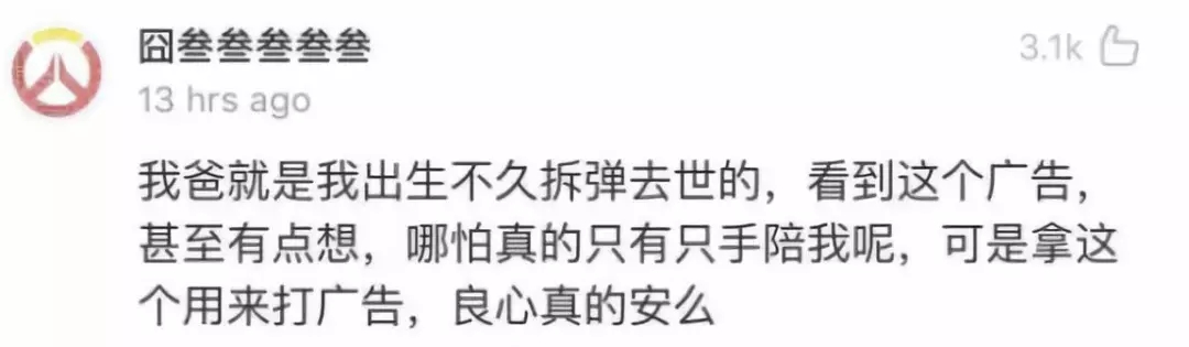 @囧叁叁叁叁叁:我爸就是我出生不久拆彈去世的,看到這個廣告,甚至有點想,哪怕真的只有只手陪我呢,可是拿這個來打廣告,良心真的安么?