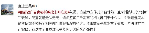 近日,“凱迪仕智能鎖”新浪微博賬號發(fā)布的一則“拆彈磚家”視頻廣告引發(fā)爭議。視頻中,為宣傳其產品“只有一只手也能開鎖”的性能,使用了“排雷戰(zhàn)士”被炸得粉身碎骨回到家的情節(jié),甚至還安排了“排雷戰(zhàn)士”被“炸”成了綿羊、輪胎、電飯煲。江蘇省公安廳網(wǎng)絡安全保衛(wèi)總隊官方微博批評稱,“網(wǎng)絡營銷應有最起碼的道德是非觀念,不要把無知當創(chuàng)意,把惡搞當搞笑!”