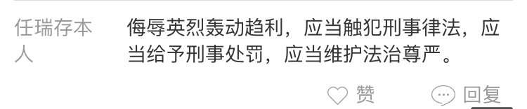 強國論壇網(wǎng)友“任瑞存本人”:侮辱英烈轟動趨利,實屬惡意踐踏正義,須要受到法治懲戒,須要接受道德警示。