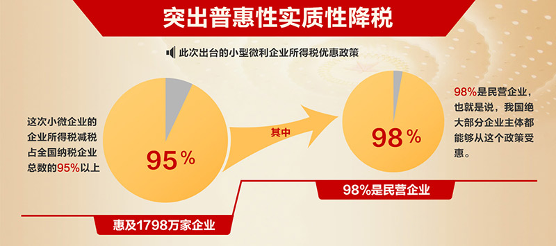 張連起:提高增值稅小規(guī)模納稅人起征點(diǎn),放寬小型微利企業(yè)標(biāo)準(zhǔn)并加大優(yōu)惠力度。這比原來認(rèn)定的標(biāo)準(zhǔn)有大幅度的提升,也就是說有更多的企業(yè)會(huì)被認(rèn)定為小型微利企業(yè)。據(jù)測算,認(rèn)定為小型微利企業(yè)戶數(shù)1798萬戶,占全部納稅企業(yè)的比重超過95%,其中98%是民營企業(yè)。也就是說,我國絕大部分企業(yè)主體都能夠從這個(gè)政策中受惠。