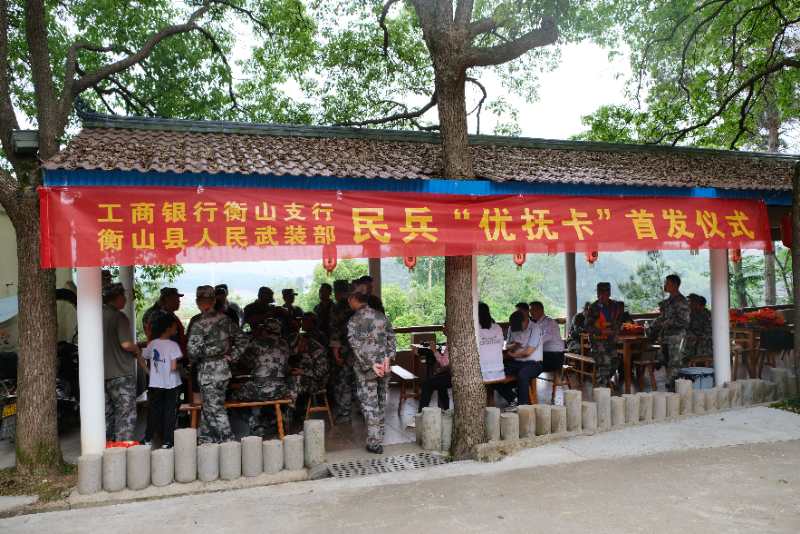 前不久,衡山縣人武部與中國工商銀行衡山支行舉行民兵“優(yōu)撫卡”首發(fā)儀式,給正在參加防汛演練的30余名基干民兵送去了一份特別的小禮物——“隨軍行擁軍優(yōu)撫卡”。 這張卡,是今年年初該縣人武部主動與銀行進行溝通協(xié)調(diào)后,專門設(shè)計制作的一張融身份識別功能與金融服務功能于一體的民兵優(yōu)撫卡。卡的正面背景圖案是一位身著軍裝的民兵照片,并印有“隨軍行擁軍優(yōu)撫卡”字樣。